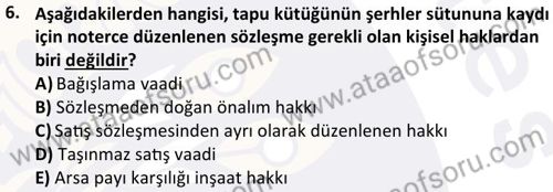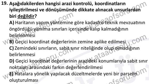 Tapu ve Kadastro Bilgisi Dersi 2024-2025 Bahar Dönemi Bütünleme Sınavı Çıkmış Sınav Soruları ve Özetleri. Geçmiş dönemlere ait sınav sorularını çözerek sınavlarda gelebilecek soru kalıplarının ve benzer soruları yakalamanız daha kolay olacaktır. Çıkmış sınav soruları ile beraber konu anlatımı, ders özetleri ve online deneme sınavları ile sınavlara hazrılanabilirsin.