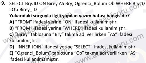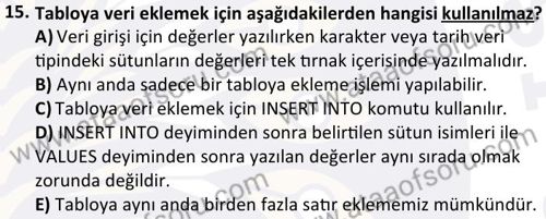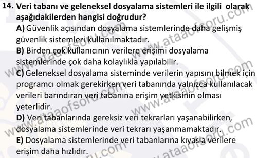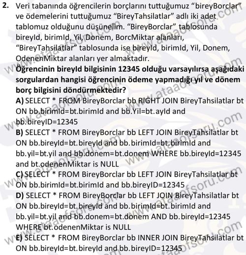 Veri Tabanı Yönetim Sistemleri Dersi 2024-2025 Bahar Dönemi Final Sınavı Çıkmış Sınav Soruları ve Özetleri. Geçmiş dönemlere ait sınav sorularını çözerek sınavlarda gelebilecek soru kalıplarının ve benzer soruları yakalamanız daha kolay olacaktır. Çıkmış sınav soruları ile beraber konu anlatımı, ders özetleri ve online deneme sınavları ile sınavlara hazrılanabilirsin.