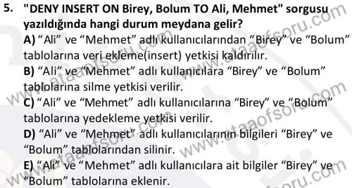 Veri Tabanı Yönetim Sistemleri Dersi Final Deneme Sınavı (27 Nisan)